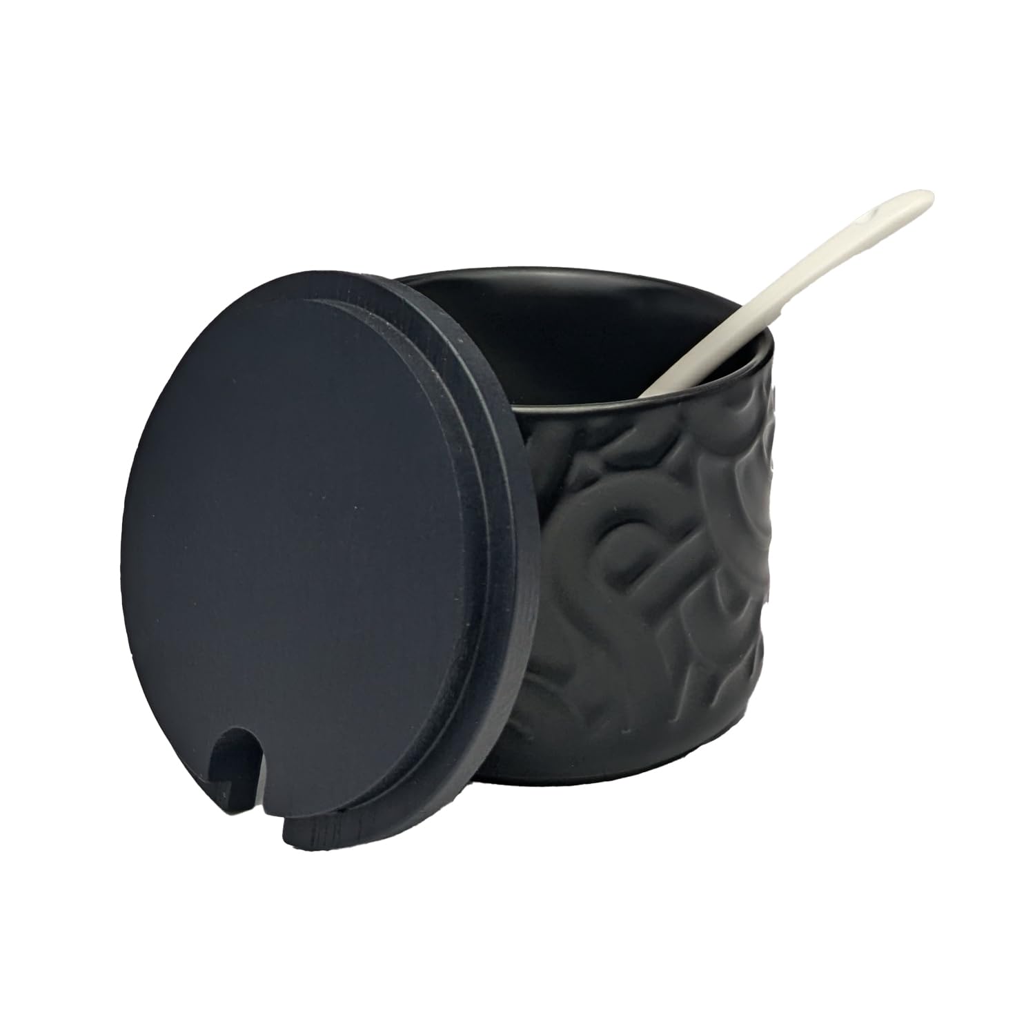 Keramik Gewürzdose mit Löffel und Deckel, schwarz, 7 cm hoch, Ø 8,5 cm, für Zucker, Salz, Tee und Gewürze