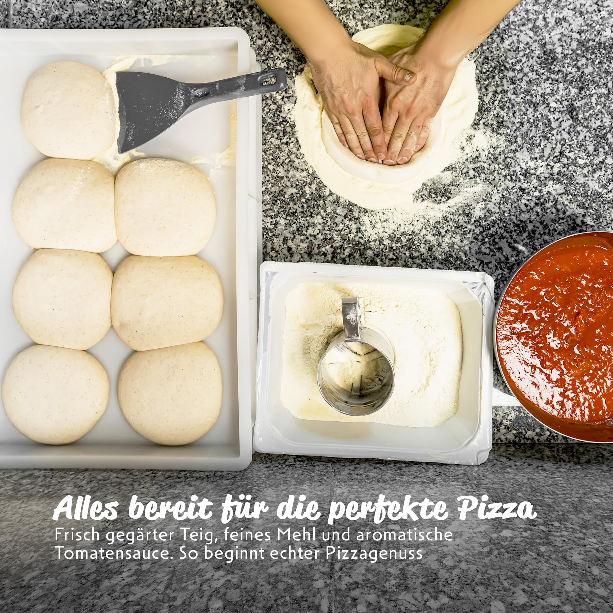- • Komplett-Set für echte Pizza: Pizzaballenbox mit Deckel, 4x San Marzano DOP (La Carmela), Mehle von Molino Dalla Giovanna (LaNapoletana, Semola Rimacinata, Uniqua), Farina per Pizza, 2x Paneangeli Hefe, E-Book.