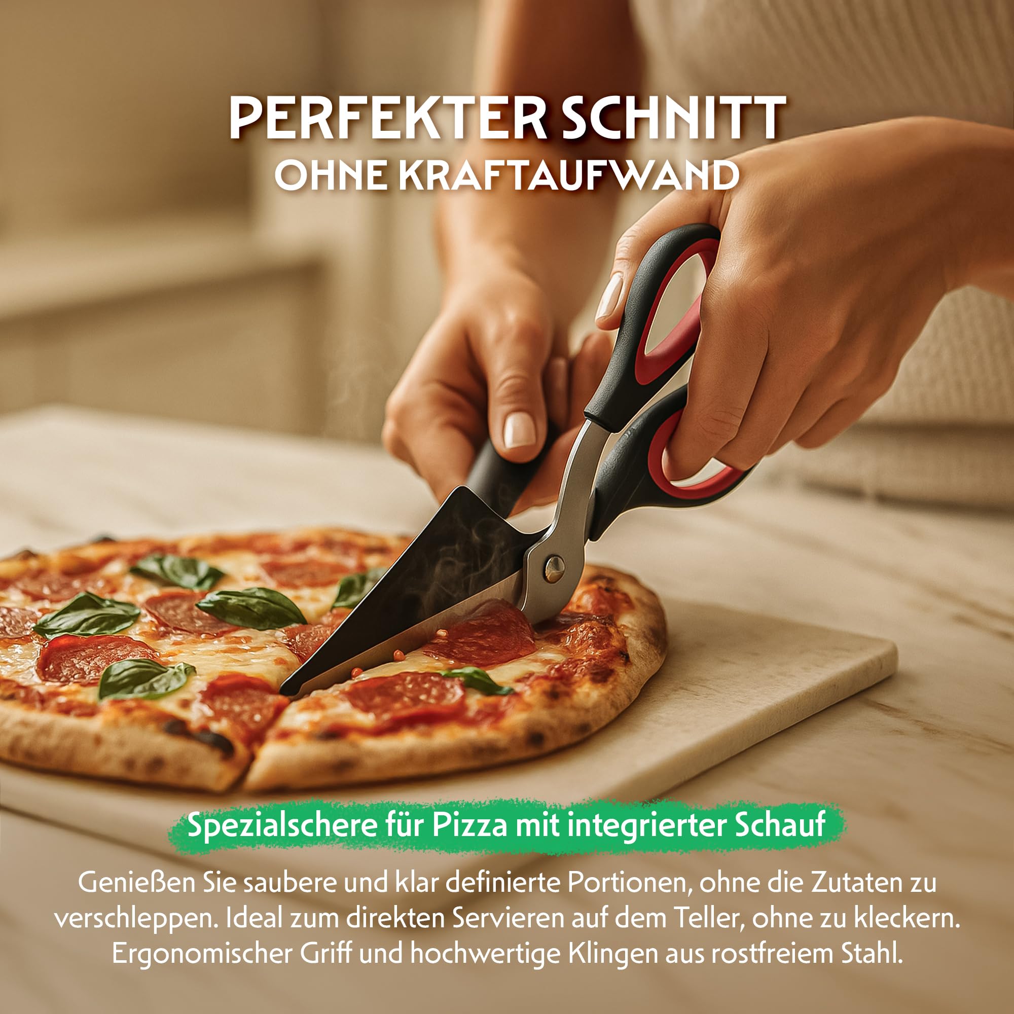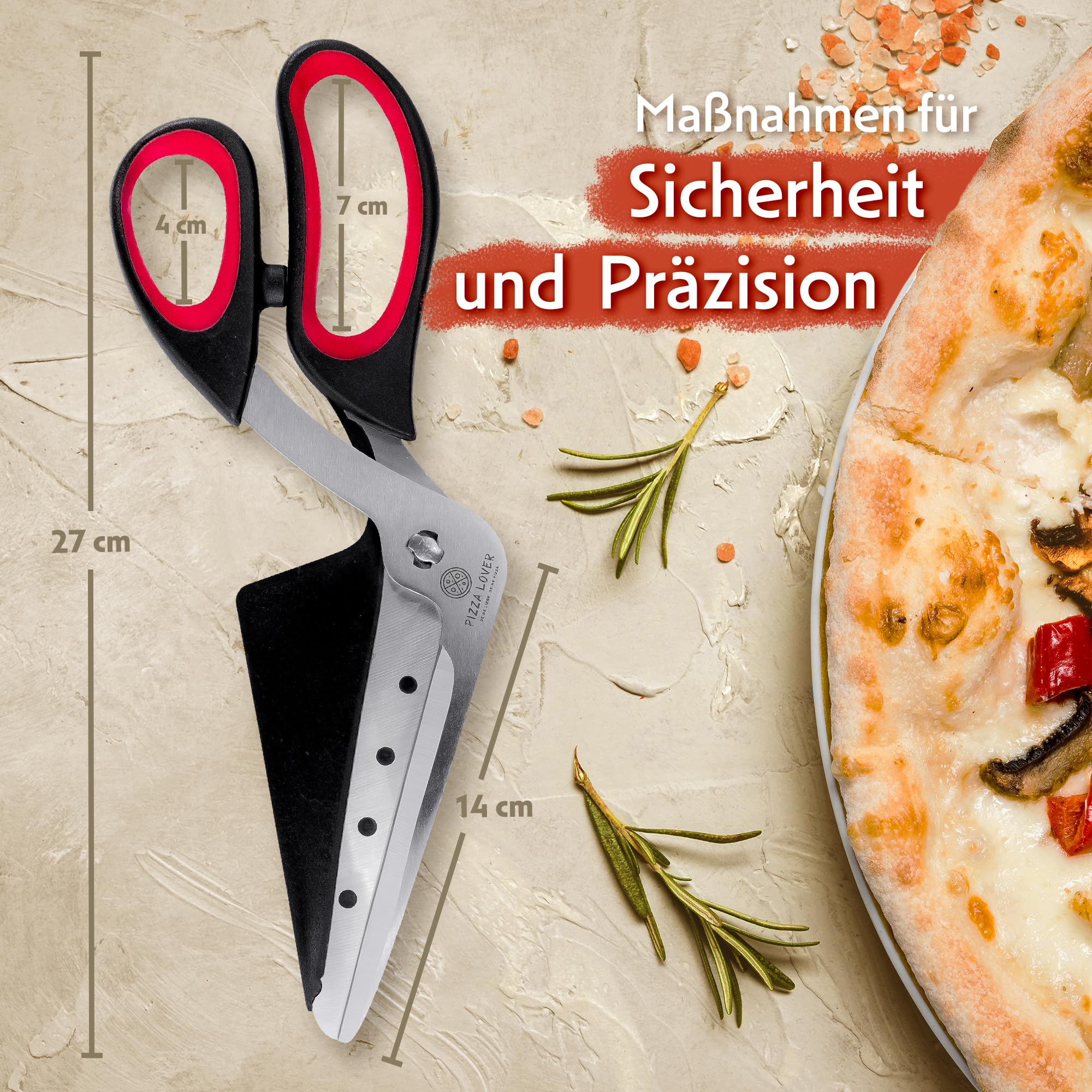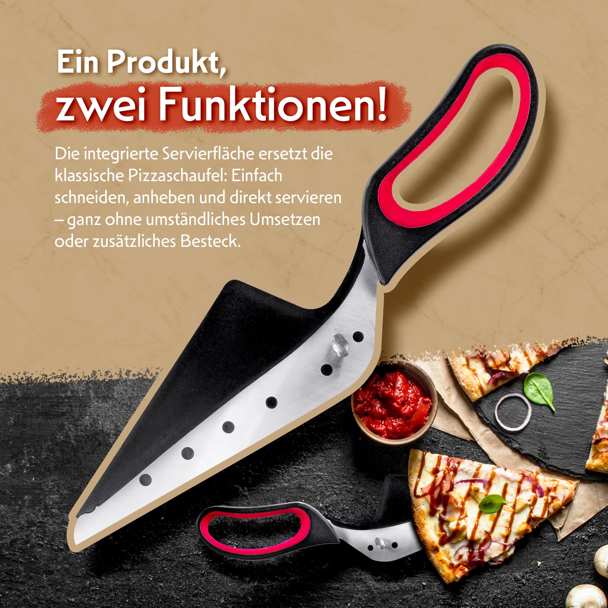 Pizza Lover Pizzaschere Edelstahl mit Antirutsch Griff und inkl. abtrennbare Servierschaufel - Küchenschere auch für Flammkuchen & Kuchen - Pizzazubehör - Spülmaschinenfest - Rot/Shwarz