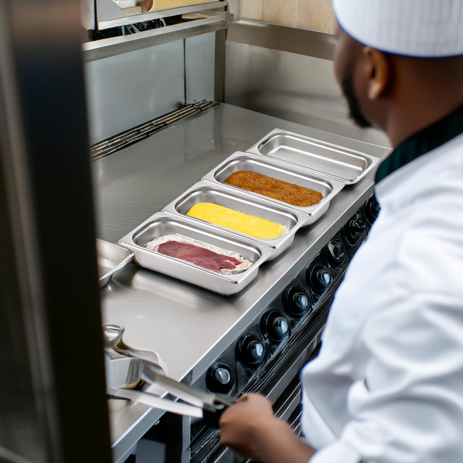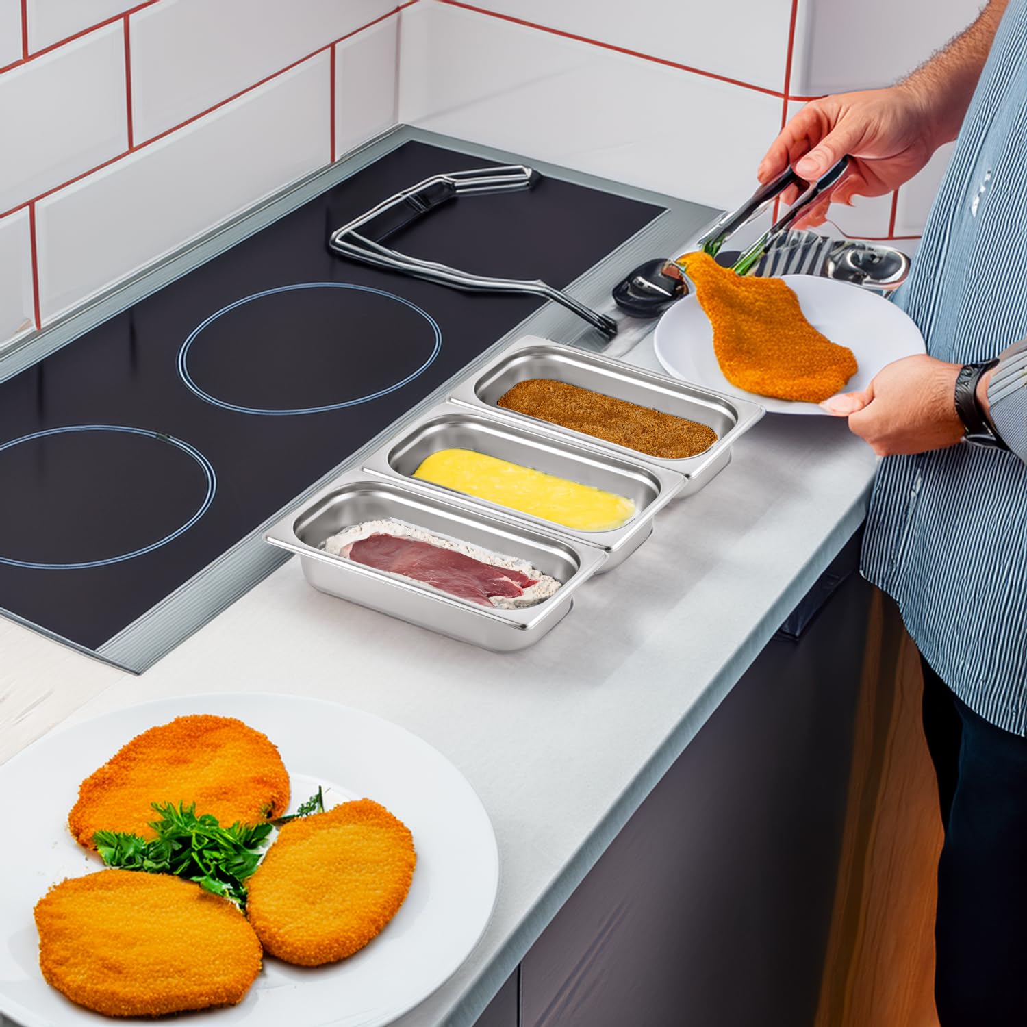 Morleos 3x Panierschalen + Rote Zange | GN 1/3 Edelstahl Metall Schalen je 32,5 x 17,6 x 6,5 cm | Volumen: 7,5 Liter | Panieren & Marinieren Fleisch, Schnitzel | 0,7 mm dick
