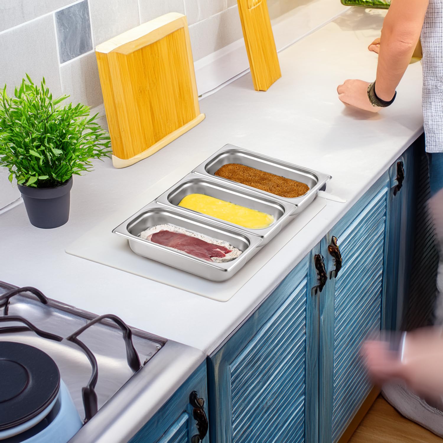 <p>Kein Kleckern, Schmieren oder Bröseln.</p> <p>Mithilfe des Morleos Panier-Set S bestehend aus drei stabilen ( 0,7 mm Stärke ) 201 Edelstahlschalen mit einer Tiefe von 65 mm gehört dies der Vergangenheit an. Durch das Einzelgewicht einer Schale von 330 g ist das verwenden dieser Panierstraße individuell anpassbar.</p> <p>Die Außenmaße sind genormt nach dem europäischen GN Standard Rahmen und sind 325 mm Lang und 176 mm Breit sowie eine Tiefe von 65 mm. ( Der Rahmen ist die Aufsatzfläche, welche Sie verwenden können um den Behälter z.B. in eine Saladette oder in einer Kühlaufsatzvitrine einzuhängen )</p> <p>Das Innenmaß in dem Sie die Zutaten legen können ist 300 mm Lang und 151 mm Breit und somit sind diese Behälter perfekt zum panieren von zum Beispiel Ihres nächsten Schnitzels oder Backfisches geeignet.</p> <p>Die Behälter sind stapelbar und spülmaschinefest. Darüber hinaus können Sie diese auch in Ihrem Backofen verwenden. Sie sind stapelbar und äußerst robust.</p> <p>Lieferumfang:<br /> - drei GN 1/3 65 mm Edelstahlschalen ( 32,5 cm x 17,6 cm x 6,5 cm ) GastroNorm Maß</p> - Variation mit Greifzange möglich
