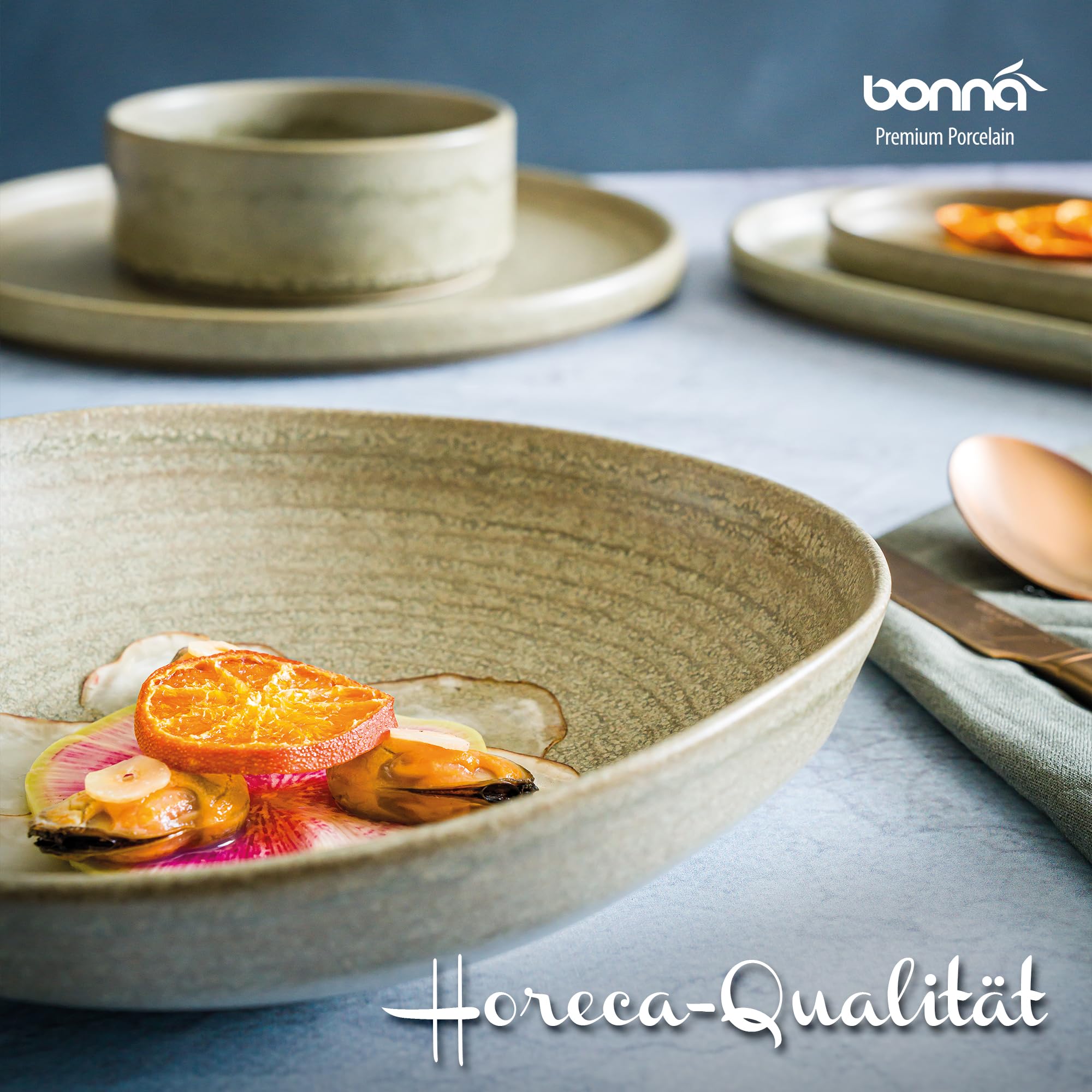 Bonna Adelfa Ripple – Tiefe Teller Ø 26 cm im 6er Set (Porzellan, Grün)<br /><br />Verleihen Sie Ihren Speisen eine stilvolle Präsentation – mit den Bonna Adelfa Ripple tiefen Tellern Ø 26 cm im 6er Set. Diese Teller verbinden modernes Design mit professioneller Qualität und sind ideal für den täglichen Einsatz ebenso wie für besondere Anlässe.<br /><br />Die großzügige, tiefe Form macht sie perfekt für Pasta, Suppen, Salate, Bowls oder vollwertige Hauptgerichte. Mit einem Durchmesser von 26 cm bieten sie reichlich Platz für kreative Anrichtungsvarianten und setzen Ihre Speisen perfekt in Szene – sowohl zu Hause als auch in der Gastronomie.<br /><br />Die charakteristische Ripple-Struktur in Kombination mit der reaktiven Glasur in elegantem Grün macht jeden Teller zu einem Unikat. Das sorgt für eine edle Haptik und eine natürliche Optik, die jedem Tischgedeck Eleganz verleiht.<br /><br />Gefertigt aus hochwertigem Porzellan in Horeca-Qualität, überzeugen die Teller durch Robustheit, Stoßfestigkeit und Langlebigkeit – ideal für den privaten Haushalt ebenso wie für Restaurants, Cafés und Hotels.<br /><br />Natürlich sind die Teller spülmaschinenfest und mikrowellengeeignet, was sie besonders pflegeleicht und alltagstauglich macht.<br /><br />Mit den Bonna Adelfa Ripple tiefen Tellern Ø 26 cm holen Sie sich Qualität, Funktionalität und Eleganz auf den Tisch – für Alltag, Gastronomie und besondere Momente.