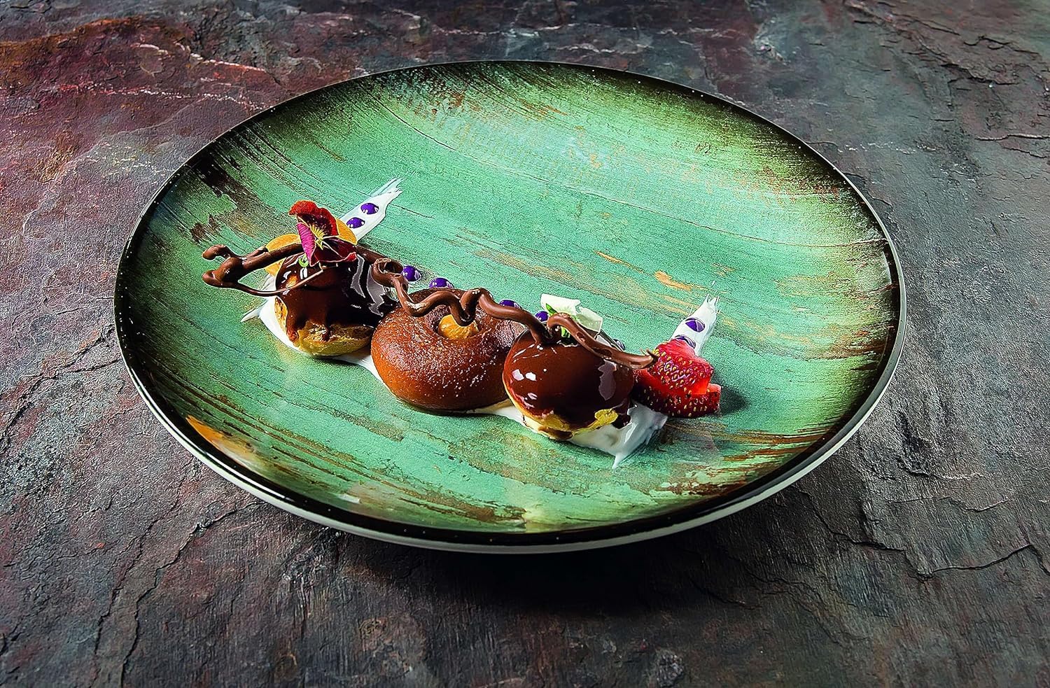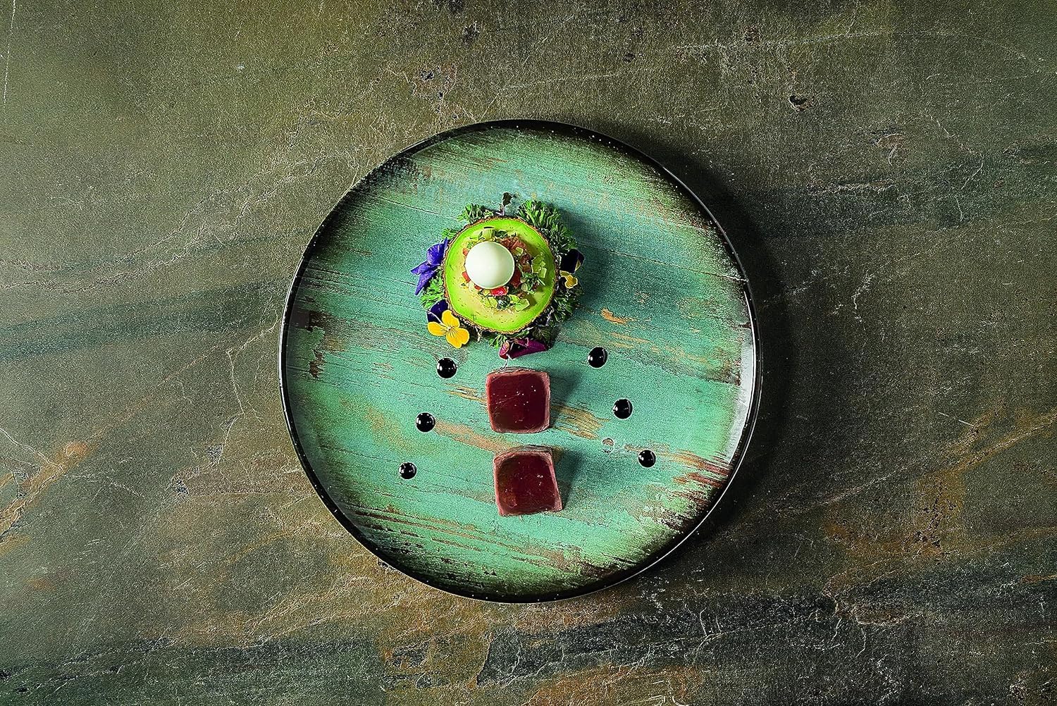- • MATERIAL: Premium Porzellan | Durchmesser: 27 cm | Gewicht: 0,8 Kg | Farbe: Madera Mint ( Grün, Braun, Türkis ) | Variante: Gourmet Teller |