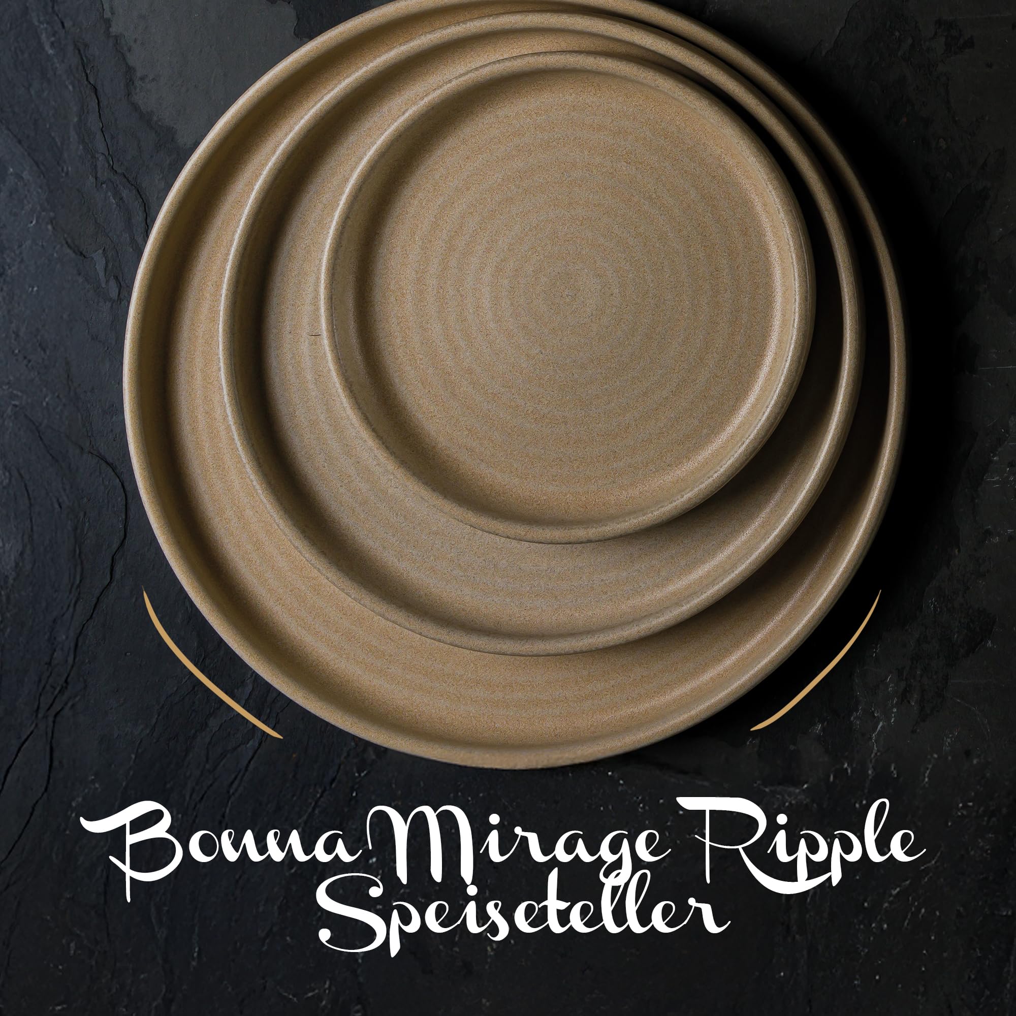 Bonna Mirage Ripple – Flache Teller Ø 21 cm im 6er-Set (Porzellan, Beige)<br /><br />Verleihen Sie Ihrem Tischgedeck zeitlose Eleganz – mit den Bonna Mirage Ripple Tellern. Gefertigt aus hochwertigem Porzellan in warmem Beige überzeugen sie durch ihre charakteristische Ripple-Struktur, die jedem Teller eine einzigartige Optik und eine edle Haptik verleiht.<br /><br />Mit einem Durchmesser von 21 cm sind die Teller vielseitig einsetzbar – ob für Vorspeisen, Salate, Desserts, Frühstück oder kleine Hauptgerichte. Sie sind die perfekte Wahl für den täglichen Gebrauch zu Hause ebenso wie für den professionellen Einsatz in Restaurants, Hotels und Cafés.<br /><br />Die robuste Horeca-Qualität sorgt für Langlebigkeit, Stoßfestigkeit und Widerstandsfähigkeit gegen Kratzer. Gleichzeitig sind die Teller spülmaschinenfest und mikrowellengeeignet, wodurch sie besonders pflegeleicht und praktisch im Alltag sind.<br /><br />Mit den Bonna Mirage Ripple Tellern Ø 21 cm servieren Sie Ihre Speisen stilvoll, modern und mit einem Hauch natürlicher Eleganz.